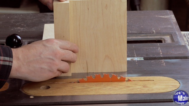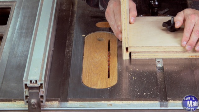 Take your 3/4″ x 8″ x 21″ plywood and cut two grooves to accommodate the dowels. This is done by rotating the stock after each cut: