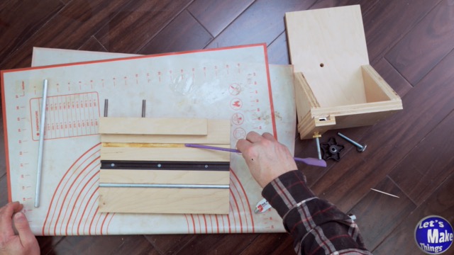 To finish the jig, add epoxy into the channels for the steel dowels. For a strong bond, sand each dowel and clean them thoroughly with a vinegar-water solution before placing them in the tracks.